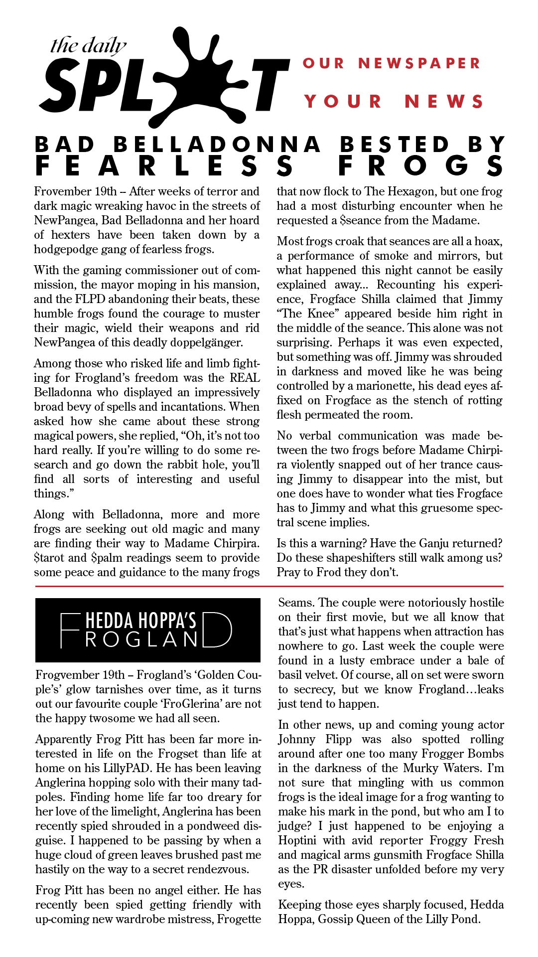 Previous11/8 - Poisonous Belladonna Pushes Townsfrogs Beyond TerrorNext12/13 - Frogland Foggy with Magic Mystery and Murder