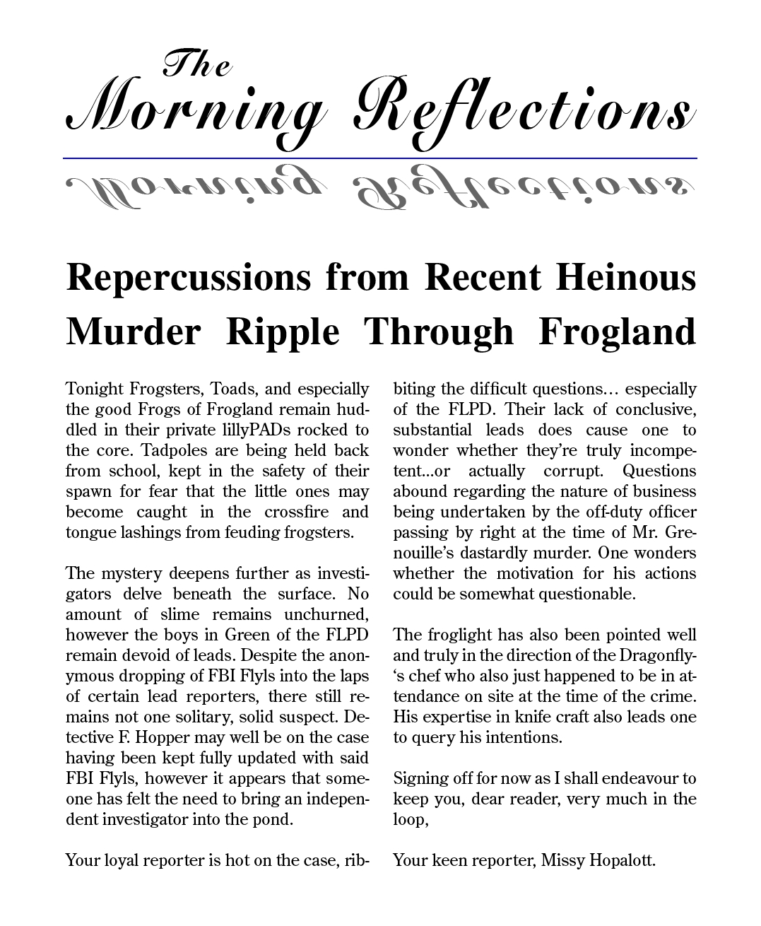 9/14 - Repercussions From Recent Heinous Murder Ripple Through Frogland