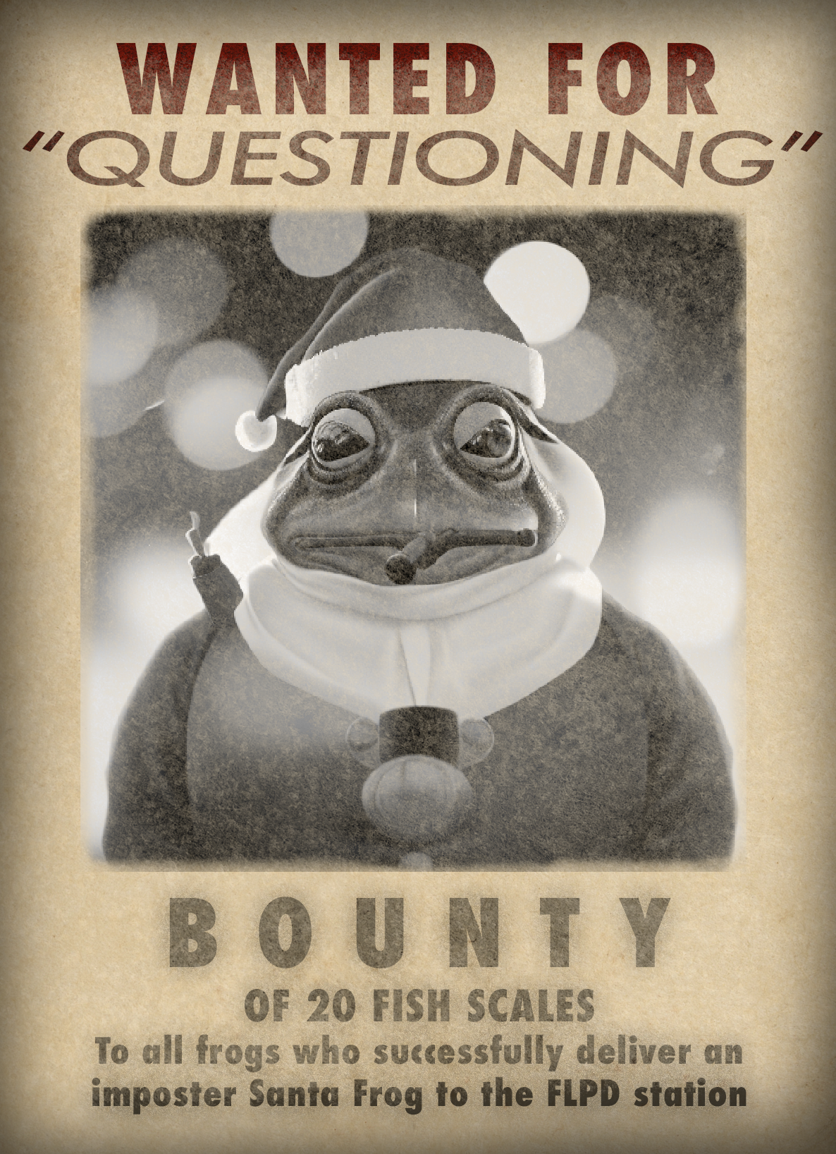 The FLPD has put out a request to the good citizens of Frogland asking for your help bringing in the imposter Santa Frogs for "questioning". After a week of unsuccessful investigation, they've even put out a bounty of 20 Fish Scales for frogs who bring in one of the Santa Frogs to the station. :eyes: